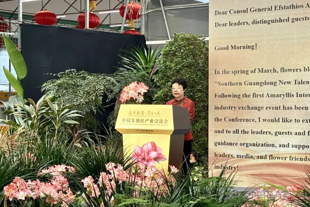 东莞市花卉协会会长、广东圣茵花卉园艺有限公司董事长周世明热烈欢迎大家的到来,她说,朱顶红国际交流论坛2003年首次举办,今年是第二次,希望通过这样的活动,进一步展现朱顶红的魅力,持续推进朱顶红产业技术交流和文化融合,助力朱顶红特色花卉产业高质量发展,为朱顶红在乡村振兴、绿美广东、美丽中国建设中做出更大的贡献。